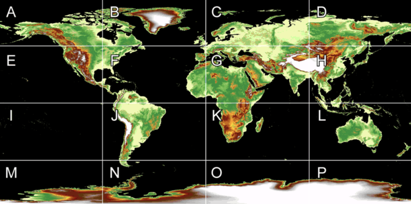 I recently decided to write a parser for NOAA's Global Land One-kilometer Base Elevation (GLOBE) dataset. Compiled in 1999, GLOBE is a coarse resolution dataset, suitable for climate/weather modelling, non-safety-critical navigation aids, and other tasks where a finer-grained model is not necessary. This dataset is a convenient format for projects that need to approximate the geological features of the Earth on a global scale while maintaining a lightweight memory footprint. 1km resolution is higher than the resolution of most weather models, such as the Global Forecast System, which has a 28km horizontal resolution, and it is a good starting point for applications like games and global basemaps.