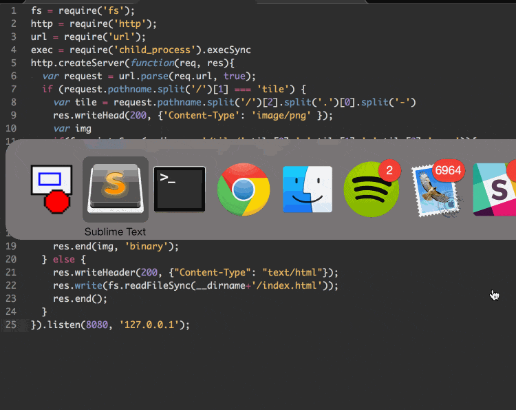 In just 25 lines of Javascript, we can even create a caching map server that integrates with Leaflet and generates tiles on the fly. Here's the DC bus system viewed in Leaflet:
